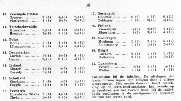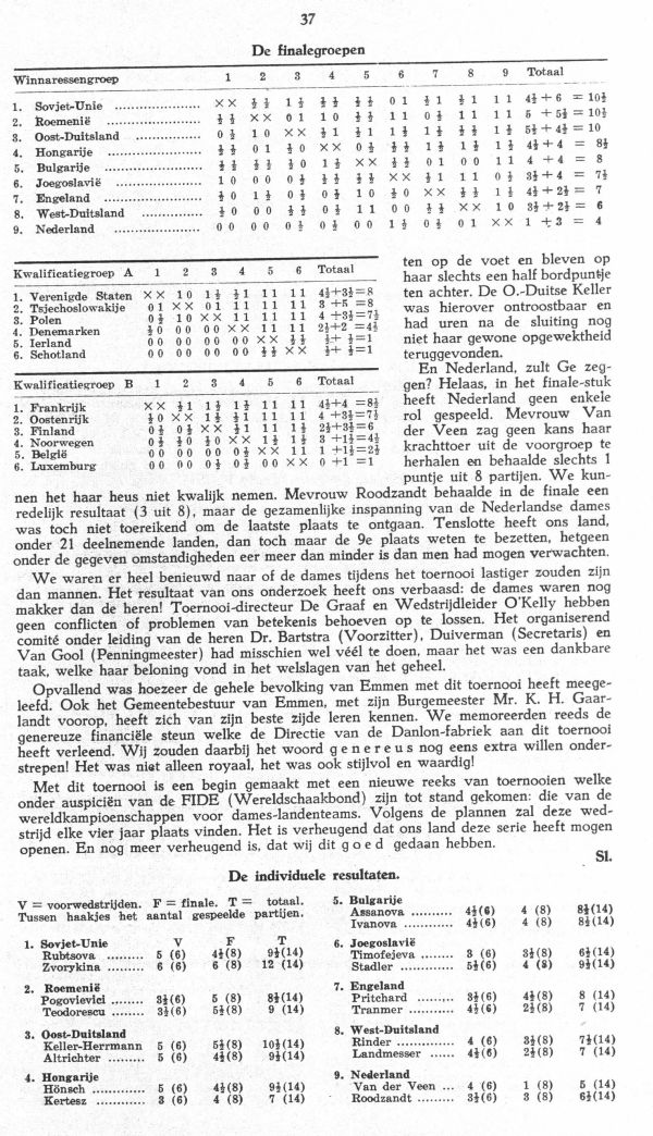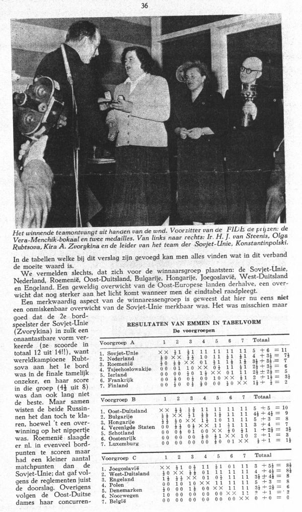 Elaine remarked to me at this time that what surprised her most was the spectacular general advance in women's chess exhibited In this tournament. We expected good performances from countries like USSR, East Germany, and Yugoslavia, and from players like Rubtsova, Zvorykina, Edith Keller-Hermann, and Madame Chaudé de Silans, but subconsciously we rather thought many smaller countries, certainly on their second boards, would be push-overs, but this was by no means the case. It will be seen that the final tournament was dominated by East European countries and there has emerged from them a new type of woman player entirely, very young and keen, and exhibiting a lot of practice in the speed of their post moslems and end-game analysis. lt seems to me that where the average woman player formerly looked for a good move, she will now look for a good idea or a procedure, and will produce fluently a lot of quite competent moves in demonstration of the validity of her idea.