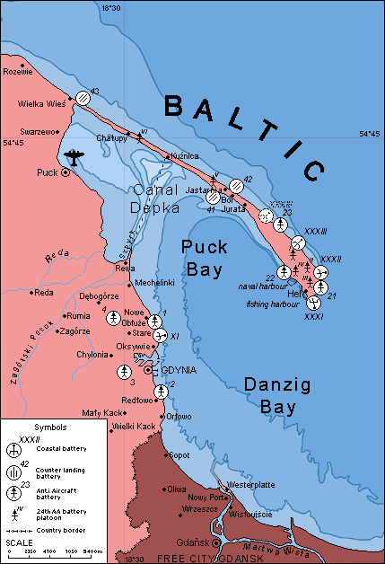 In the 1939 situation of the Naval bases, were as follows. The terrain under Polish Navy, was divided into two main parts: Hel Fortified Area, Gdynia Zone and also Military Transit Depot Westerplatte.